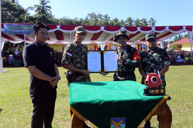 Bintuhan, Mediasinardunia.com - Bupati Kaur, Gusril Pausi, S.Sos., M.AP, menghadiri upacara pembukaan TNI Manunggal Membangun Desa (TMMD) Reguler ke-124 Kodim 0408 Bengkulu Selatan - Kaur untuk tahun anggaran 2025 di Desa Bandu Agung, Kecamatan Kaur Utara pada Selasa, 6 Mei 2025.