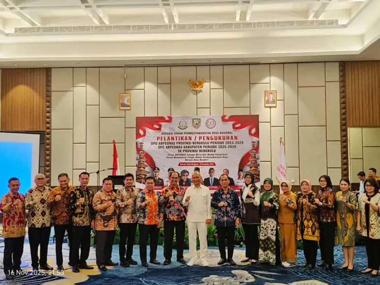 Rejang Lebong, Mediasinardunia.com - Pengurus Asosiasi Badan Permusyawaratan Desa Nasional (ABPEDNAS) Provinsi Bengkulu dan pengurus kabupaten/kota periode 2024–2029 resmi dikukuhkan dalam acara yang berlangsung di Ballroom Hotel Mercure Bengkulu, Minggu, 16 November 2025 malam. Acara tersebut dihadiri sejumlah tokoh nasional, pemerintah daerah, serta unsur organisasi desa dari seluruh wilayah Bengkulu.
