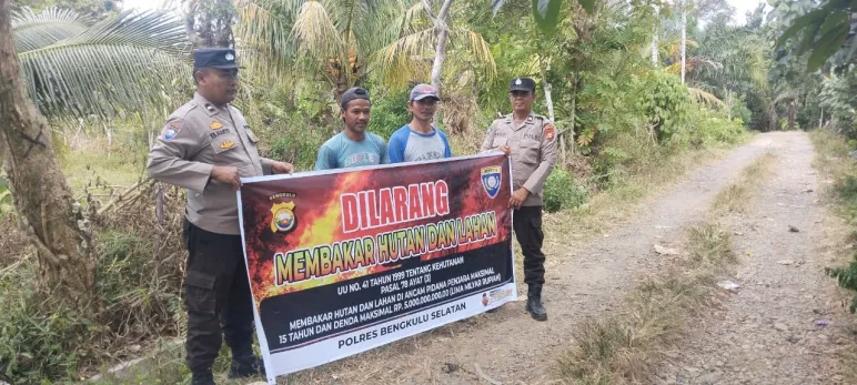Bengkulu Selatan - Mediasinardunia.com - Antisipasi adanya kebakaran hutan dan lahan (Karhutlah), Kbo Sat Binmas Ipda Slamet Rahardjo dan anggotanya sosialisasikan peraturan pemerintah tentang larangan untuk membakar hutan dan lahan yang dapat menyebabkan rusaknya ekosistem serta pencemaran udara, di RT 08 Kelurahan Gunung Ayu Kecamatan Kota Manna Bengkulu Selatan, Kamis (21/09/2023).