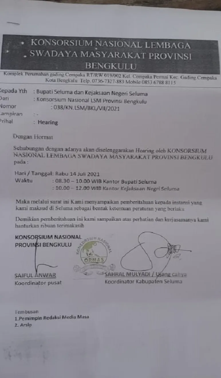 Permintaan itu disampaikan Koordinator Konsorsium Nasional LSM Bengkulu Ujang Cahya yang dalam waktu dekat akan berencana melaksanakan hearing bersama Bupati Seluma dan Kejari Tais pada 14 Juli 2021 mendatang.