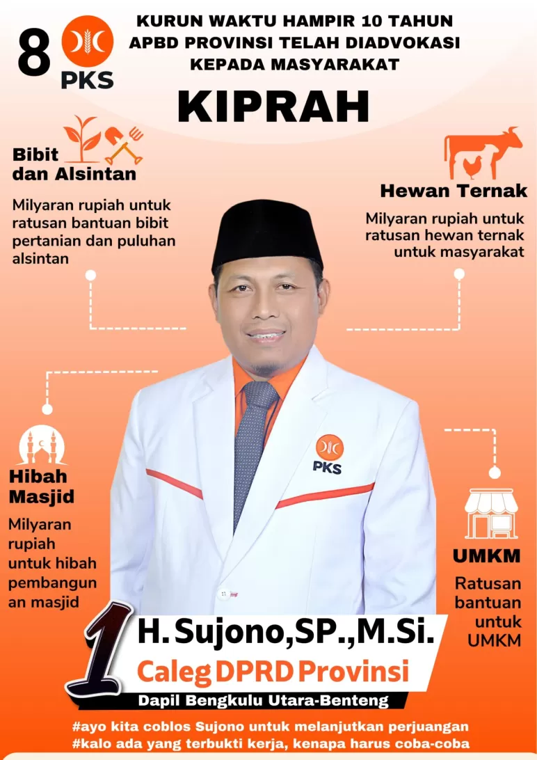Bengkulu, Mediasinardunia.com - Seiring dengan mendekati akhir tahapan kampanye pemilu, salah satu kandidat yang bersiap untuk kembali menduduki kursi legislatif DPRD Provinsi Bengkulu adalah H. Sujono, S.P, M.Si yang diusung oleh Partai Keadilan Sejahtera (PKS) dengan nomor urut 1.