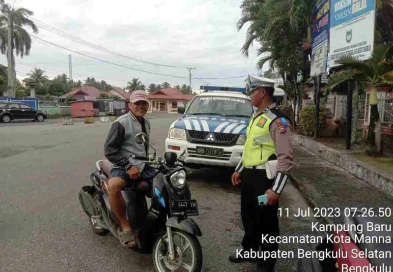Teguran simpatik, personel Sat Lantas Polres Bengkulu Selatan Polda Bengkulu Aipda Sutiyono, S.H., bersama personel lainnya ini dilakukan pada saat melaksanakan kegiatan Operasi Patuh Nala 2023 di seputaran Jalan Jendral Sudirman Kecamatan Pasar Manna Kabupaten Bengkulu Selatan.