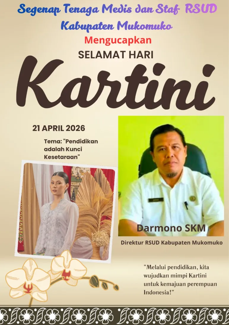 Segenap Tenaga Medis dan Staf RSUD Kabupaten Mukomuko Mengucapkan Selamat Hari Kartini (Alf/Mediasinardunia.com) Banner Segenap Tenaga Medis dan Staf RSUD Kabupaten Mukomuko Mengucapkan Selamat Hari Kartini 20 Apr 2026 07:01 Submitted by webadmin on 20 April 2026 Mukomuko Hari Kartini Mukomuko Direktur RSUD Mukomuko Berita Terkait Feb 26, 2026 Kepala Dinas PUPR Mukomuko Mengucapkan Selamat Hari Jadi Kabupaten Mukomuko yang ke-23 Feb 25, 2026 Dinas pertanian kabupaten Mukomuko mengucapkan selamat hari jadi kabupaten Mukomuko ke - 23 Tahun 2026 Feb 24, 2026 Dinas pendidikan dan kebudayaan sekolah SD negeri 04 air Manjuto Kabupaten Mukomuko Mengucapkan Dirgahayu Kabupaten Mukomuko Ke - 23 Feb 18, 2026 Sekda Kabupaten Mukomuko Mengucapkan Selamat Hari Jadi Kabupaten Mukomuko yang Ke-23 Feb 17, 2026 Dinas Pendidikan dan Kebudayaan SDN 14 Penarik Kabupaten Mukomuko Mengucapkan Dirgahayu Kabupaten Mukomuko yang Ke-23 Feb 17, 2026 Kepala Madrasah MTSN 2 Mukomuko Mengucapkan Dirgahayu Kabupaten Mukomuko yang Ke-23