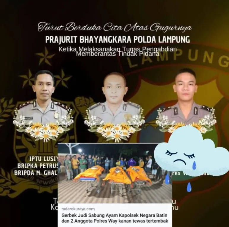 Lampung, Mediasinardunia.com - Tiga anggota kepolisian dari Polres Way Kanan gugur saat melakukan penggerebekan di lokasi perjudian sabung ayam. Insiden ini terjadi pada Senin (17/3/2025) sore sekitar pukul 16.50 WIB di Kampung Karang Manik, Kecamatan Negara Batin, Kabupaten Way Kanan, Provinsi Lampung.