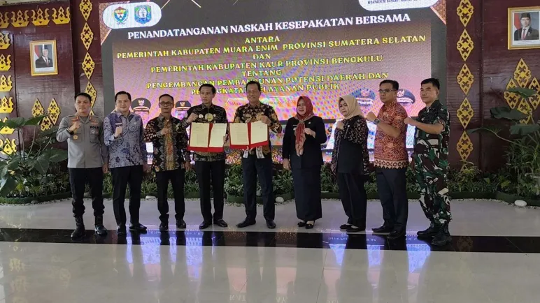 Kaur, Mediasinardunia.com - Bupati Kaur, Gusril Pausi, S.SOs. M.A.P, melakukan penandatanganan Memorandum of Understanding (MoU) dengan Bupati Muara Enim, Edison, SH, M.Hum, terkait pemanfaatan Pelabuhan Kaur sebagai jalur strategis distribusi barang dan hasil produksi daerah. Penandatanganan kerjasama tersebut dilaksanakan di Kantor Bupati Muara Enim pada Kamis (25/09/2025).