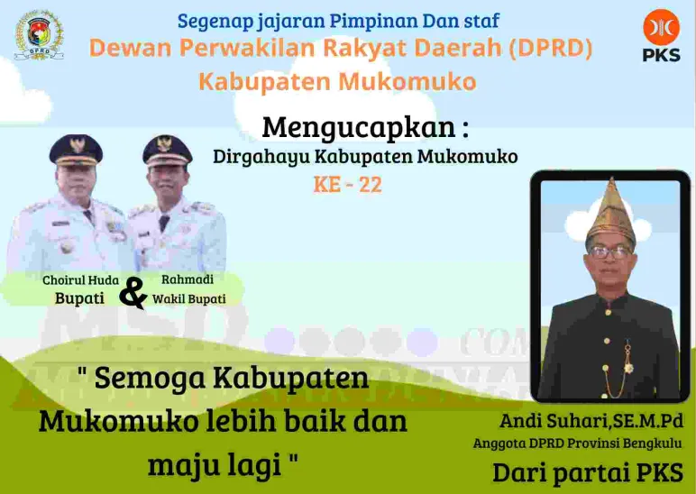 Andi Suhari,SE.M.Pd, Anggota DPRD Provinsi Bengkulu dari partai PKS.(Alf/Mediasinardunia.com) Banner Dewan Perwakilan Rakyat Daerah (DPRD) Kabupaten Mukomuko, Mengucapkan Dirgahayu Kabupaten Mukomuko Ke - 22 25 Feb 2025 02:39 Submitted by webadmin on 25 February 2025 " Semoga Kabupaten Mukomuko lebih baik dan maju lagi " Mukomuko Berita Terkait Apr 20, 2026 Segenap Tenaga Medis dan Staf RSUD Kabupaten Mukomuko Mengucapkan Selamat Hari Kartini Feb 26, 2026 Kepala Dinas PUPR Mukomuko Mengucapkan Selamat Hari Jadi Kabupaten Mukomuko yang ke-23 Feb 25, 2026 Dinas pertanian kabupaten Mukomuko mengucapkan selamat hari jadi kabupaten Mukomuko ke - 23 Tahun 2026 Feb 24, 2026 Dinas pendidikan dan kebudayaan sekolah SD negeri 04 air Manjuto Kabupaten Mukomuko Mengucapkan Dirgahayu Kabupaten Mukomuko Ke - 23 Feb 18, 2026 Sekda Kabupaten Mukomuko Mengucapkan Selamat Hari Jadi Kabupaten Mukomuko yang Ke-23 Feb 17, 2026 Dinas Pendidikan dan Kebudayaan SDN 14 Penarik Kabupaten Mukomuko Mengucapkan Dirgahayu Kabupaten Mukomuko yang Ke-23