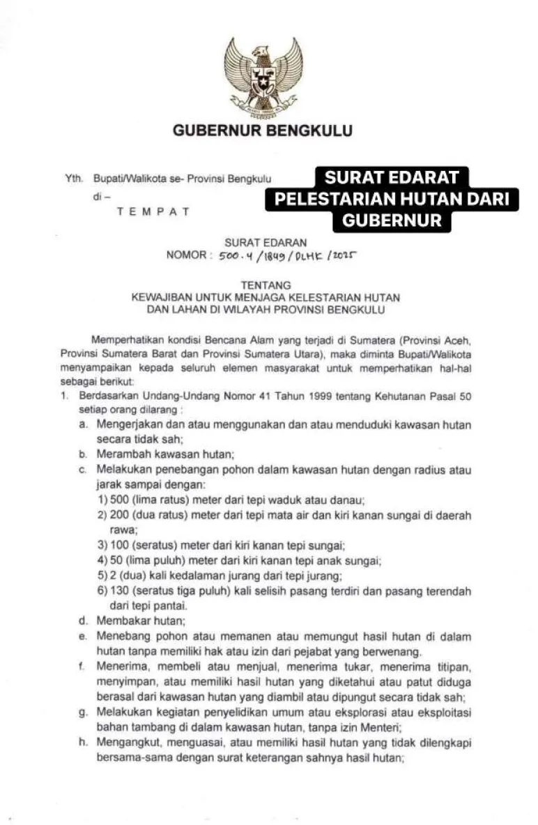 Gubernur Bengkulu Keluarkan Edaran, Atur Kewajiban Jaga Kelestarian Hutan dan Lahan