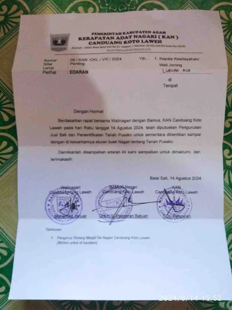 Ketiga lembaga ini Sepakat Untuk memutuskan Seluruh kepengurusan akta jual beli dan sertifikat Tanah Pusako Untuk Sementara waktu Dihentikan Cuma Surat edaran tersebut Kalau kita lihat dari fisiknya tembusanya Hanya kepada Garin mesjid Di wilayah tersebut untuk Di bacakan Di corong Corong Mig mushola Ini Sungguh Tidak masuk Kategori dan Bisa Diterima akal Sehat .