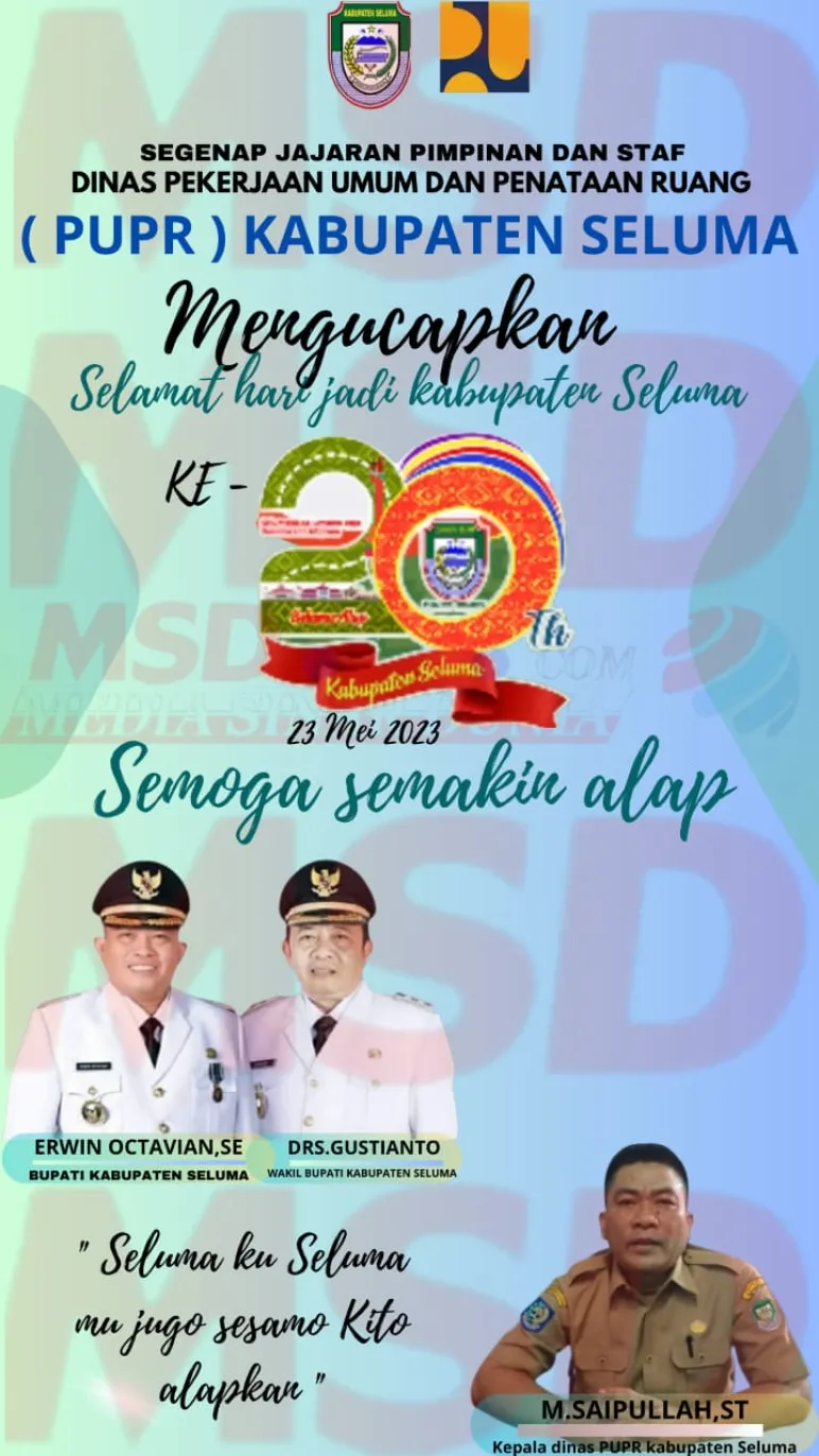Banner Dinas Pekerjaan Umum Dan Penataan Ruang (PUPR) Kabupaten Seluma Mengucapkan Selamat Hari Jadi Kabupaten Seluma Ke-20 Tahun 23 May 2023 14:12 Submitted by webadmin on 23 May 2023 Seluma Berita Terkait Apr 20, 2026 Segenap Tenaga Medis dan Staf RSUD Kabupaten Mukomuko Mengucapkan Selamat Hari Kartini Feb 26, 2026 Kepala Dinas PUPR Mukomuko Mengucapkan Selamat Hari Jadi Kabupaten Mukomuko yang ke-23 Feb 25, 2026 Dinas pertanian kabupaten Mukomuko mengucapkan selamat hari jadi kabupaten Mukomuko ke - 23 Tahun 2026 Feb 24, 2026 Dinas pendidikan dan kebudayaan sekolah SD negeri 04 air Manjuto Kabupaten Mukomuko Mengucapkan Dirgahayu Kabupaten Mukomuko Ke - 23 Feb 18, 2026 Sekda Kabupaten Mukomuko Mengucapkan Selamat Hari Jadi Kabupaten Mukomuko yang Ke-23 Feb 17, 2026 Dinas Pendidikan dan Kebudayaan SDN 14 Penarik Kabupaten Mukomuko Mengucapkan Dirgahayu Kabupaten Mukomuko yang Ke-23