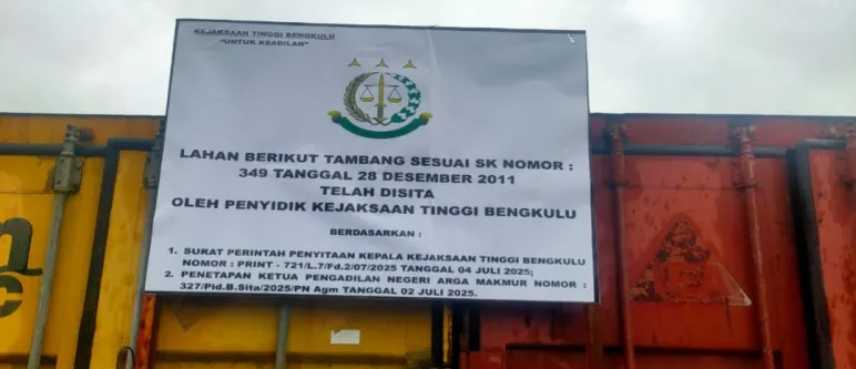 “Sore hari ini kami melakukan penyitaan terhadap tambang PT. RSM. Penyitaam sesuai dengan penetapan ketua Pengadilan Negeri (PN) Arga Makmur dan surat perintah penyitaan dari Kepala Kejaksaan Tinggi Bengkulu,” kata Kepala Seksi Penyidikan (Kasidik) Kejaksaan Tinggi Bengkulu, Danang Prasetyo, di Bengkulu Tengah, Minggu (6/7/2025).