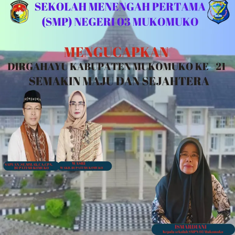 Kepala sekolah SMPN 03 Kabupaten Mukomuko Ibu Ismardiani Banner Keluarga Besar SMPN 03 Mukomuko, Nengucapkan Dirgahayu kabupaten Mukomuko Yang Ke - 21.Semoga Semakin Maju Dan Sejahtera. 12 Feb 2024 14:18 Submitted by webadmin on 12 February 2024 Mukomuko Berita Terkait Apr 20, 2026 Segenap Tenaga Medis dan Staf RSUD Kabupaten Mukomuko Mengucapkan Selamat Hari Kartini Feb 26, 2026 Kepala Dinas PUPR Mukomuko Mengucapkan Selamat Hari Jadi Kabupaten Mukomuko yang ke-23 Feb 25, 2026 Dinas pertanian kabupaten Mukomuko mengucapkan selamat hari jadi kabupaten Mukomuko ke - 23 Tahun 2026 Feb 24, 2026 Dinas pendidikan dan kebudayaan sekolah SD negeri 04 air Manjuto Kabupaten Mukomuko Mengucapkan Dirgahayu Kabupaten Mukomuko Ke - 23 Feb 18, 2026 Sekda Kabupaten Mukomuko Mengucapkan Selamat Hari Jadi Kabupaten Mukomuko yang Ke-23 Feb 17, 2026 Dinas Pendidikan dan Kebudayaan SDN 14 Penarik Kabupaten Mukomuko Mengucapkan Dirgahayu Kabupaten Mukomuko yang Ke-23