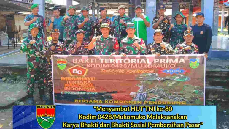 Mukomuko, Mediasinardunia.com - Dalam rangka menyambut Hari Ulang Tahun (HUT) ke-80 Tentara Nasional Indonesia (TNI), Kodim 0428/Mukomuko melaksanakan kegiatan karya bakti pembersihan pasar di Desa Lubuk Mukti Sp1, Kecamatan Penarik, Kabupaten Mukomuko, pada Sabtu, 20 September 2025. Kegiatan ini dihadiri oleh berbagai pihak, termasuk Personel TNI, Polri, Banser, Komcad, perangkat Kecamatan, Ibu-ibu Persit, dan masyarakat setempat.