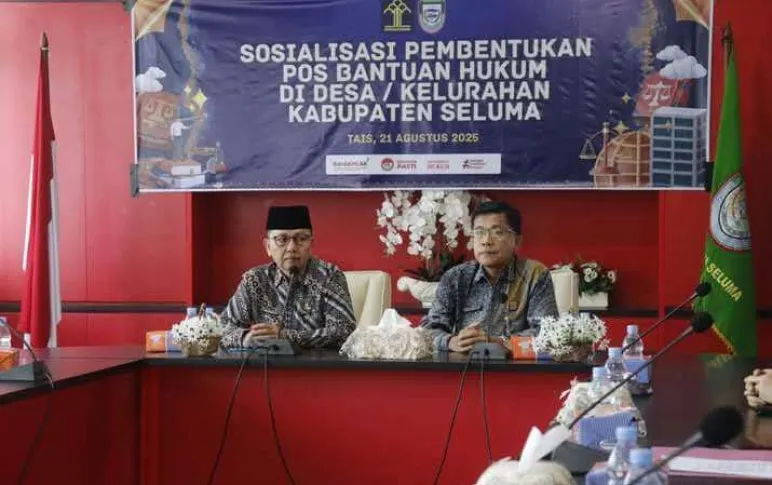 Seluma, Mediasinardunia.com - Pemerintah Kabupaten Seluma, melalui Asisten Pemerintahan dan Kesra Setda Kabupaten Seluma, H. Hendarsyah, S.I.P., M.T., membuka kegiatan Sosialisasi Pembentukan Pos Bantuan Hukum (Posbankum) bagi desa dan kelurahan pada Kamis (21/08/2025). Acara berlangsung di Ruang Rapat Bupati Seluma dengan menghadirkan tim penyuluh dari Kementerian Hukum dan HAM Provinsi Bengkulu sebagai narasumber.