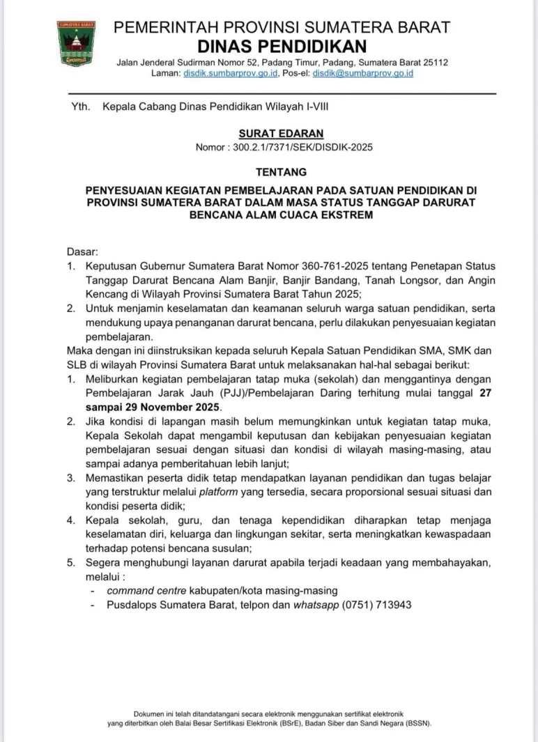 Sumatra Barat, Mediasinardunia.com - Pemerintah Provinsi Sumatera Barat (Pemprov Sumbar) menerbitkan surat edaran tentang penyesuaian kegiatan pembelajaran pada satuan pendidikan selama masa status tanggap darurat bencana alam akibat cuaca ekstrem. Kegiatan pembelajaran tatap muka dialihkan menjadi pembelajaran jarak jauh melalui berbagai platform digital mulai tanggal 27 sampai 29 November 2025.