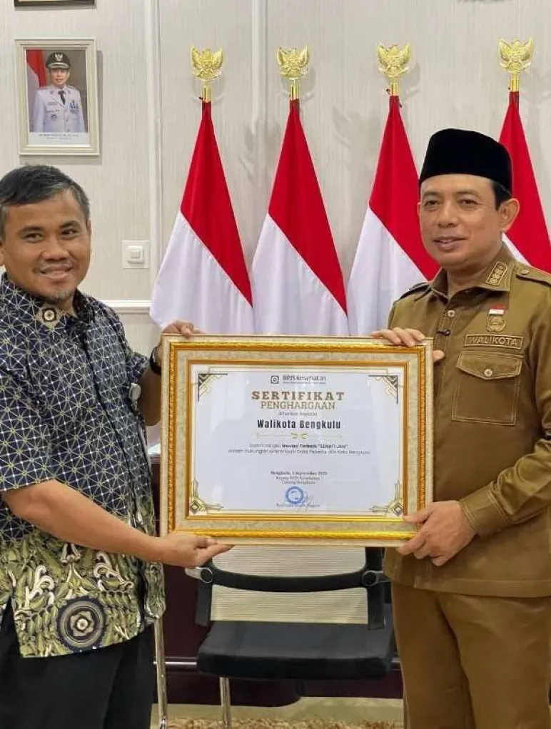Bengkulu, Mediasinardunia.com - Walikota Bengkulu, Dr. Dedy Wahyudi, S.E., M.M., menerima penghargaan atas inovasi "Sehati" (Sistem Evaluasi Harian Tindak Lanjut JKN) pada Selasa, 30 September 2025, di ruang kerjanya. Penghargaan ini diserahkan langsung oleh Kepala BPJS Kesehatan Cabang Bengkulu, Syafrudin Imam Negara.
