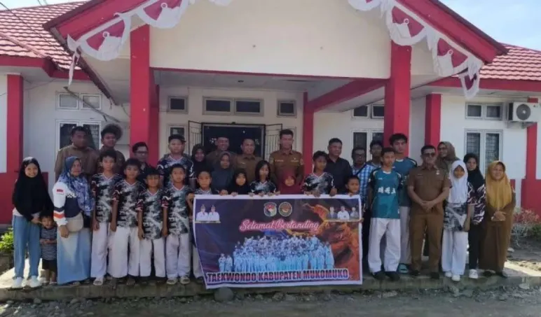 Kegiatan pelepasan berlangsung di Kantor Disparpora Mukomuko, Senin (22/12/2025), dan didampingi Kadisparpora Mukomuko Ujang Selamat, jajaran Ketua Taekwondo Mukomuko Damsir, pengurus, serta para atlet.