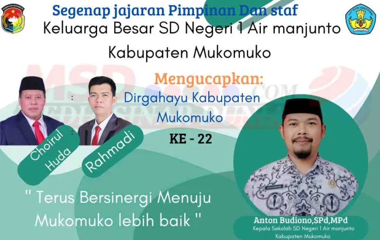 Anton Budiono, SPd.MPd, Kepala sekolah SD Negeri 1 Air manjunto Kabupaten Mukomuko.(Alf/mediasinardunia.com) Banner Keluarga Besar SD Negeri 1 Air manjunto Kabupaten Mukomuko, Mengucapkan Dirgahayu Kabupaten Mukomuko Ke - 22 11 Feb 2025 02:12 Submitted by webadmin on 11 February 2025 " Terus Bersinergi Menuju Mukomuko lebih baik" Mukomuko Berita Terkait Apr 20, 2026 Segenap Tenaga Medis dan Staf RSUD Kabupaten Mukomuko Mengucapkan Selamat Hari Kartini Feb 26, 2026 Kepala Dinas PUPR Mukomuko Mengucapkan Selamat Hari Jadi Kabupaten Mukomuko yang ke-23 Feb 25, 2026 Dinas pertanian kabupaten Mukomuko mengucapkan selamat hari jadi kabupaten Mukomuko ke - 23 Tahun 2026 Feb 24, 2026 Dinas pendidikan dan kebudayaan sekolah SD negeri 04 air Manjuto Kabupaten Mukomuko Mengucapkan Dirgahayu Kabupaten Mukomuko Ke - 23 Feb 18, 2026 Sekda Kabupaten Mukomuko Mengucapkan Selamat Hari Jadi Kabupaten Mukomuko yang Ke-23 Feb 17, 2026 Dinas Pendidikan dan Kebudayaan SDN 14 Penarik Kabupaten Mukomuko Mengucapkan Dirgahayu Kabupaten Mukomuko yang Ke-23