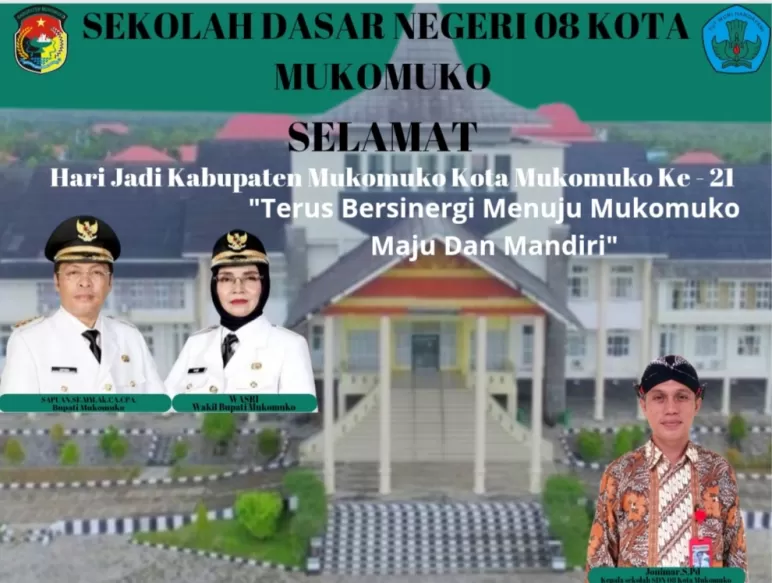 Kepala sekolah negeri 08 Kota Mukomuko ,Junimart,S,Pd Banner Keluarga Besar SDN 08 KOTA Mukomuko Mukomuko, Mengucapkan Selamat hari Jadi kabupaten Mukomuko Yang Ke - 21. "Terus Bersinergi Menuju Mukomuko Maju Dan Mandiri" 21 Feb 2024 13:19 Submitted by webadmin on 21 February 2024 Mukomuko Berita Terkait Feb 26, 2026 Kepala Dinas PUPR Mukomuko Mengucapkan Selamat Hari Jadi Kabupaten Mukomuko yang ke-23 Feb 25, 2026 Dinas pertanian kabupaten Mukomuko mengucapkan selamat hari jadi kabupaten Mukomuko ke - 23 Tahun 2026 Feb 24, 2026 Dinas pendidikan dan kebudayaan sekolah SD negeri 04 air Manjuto Kabupaten Mukomuko Mengucapkan Dirgahayu Kabupaten Mukomuko Ke - 23 Feb 18, 2026 Sekda Kabupaten Mukomuko Mengucapkan Selamat Hari Jadi Kabupaten Mukomuko yang Ke-23 Feb 17, 2026 Dinas Pendidikan dan Kebudayaan SDN 14 Penarik Kabupaten Mukomuko Mengucapkan Dirgahayu Kabupaten Mukomuko yang Ke-23 Feb 17, 2026 Kepala Madrasah MTSN 2 Mukomuko Mengucapkan Dirgahayu Kabupaten Mukomuko yang Ke-23