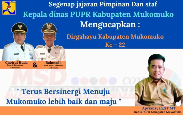 Apriansyah, ST.MT, Kadis PUPR Kabupaten Mukomuko.(Alf/mediasinardunia.com) Banner Kepala Dinas PUPR Kabupaten Mukomuko, Mengucapkan Dirgahayu Kabupaten Mukomuko Ke - 22 22 Feb 2025 06:21 Submitted by webadmin on 22 February 2025 Mukomuko Berita Terkait Apr 20, 2026 Segenap Tenaga Medis dan Staf RSUD Kabupaten Mukomuko Mengucapkan Selamat Hari Kartini Feb 26, 2026 Kepala Dinas PUPR Mukomuko Mengucapkan Selamat Hari Jadi Kabupaten Mukomuko yang ke-23 Feb 25, 2026 Dinas pertanian kabupaten Mukomuko mengucapkan selamat hari jadi kabupaten Mukomuko ke - 23 Tahun 2026 Feb 24, 2026 Dinas pendidikan dan kebudayaan sekolah SD negeri 04 air Manjuto Kabupaten Mukomuko Mengucapkan Dirgahayu Kabupaten Mukomuko Ke - 23 Feb 18, 2026 Sekda Kabupaten Mukomuko Mengucapkan Selamat Hari Jadi Kabupaten Mukomuko yang Ke-23 Feb 17, 2026 Dinas Pendidikan dan Kebudayaan SDN 14 Penarik Kabupaten Mukomuko Mengucapkan Dirgahayu Kabupaten Mukomuko yang Ke-23