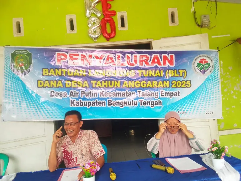 Bengkulu Tengah, Mediasinardunia.com - 3 Oktober 2025 - Pemerintah Desa Air Putih, Kecamatan Talang Empat, Kabupaten Bengkulu Tengah, menyalurkan Bantuan Langsung Tunai Dana Desa (BLT-DD) untuk bulan Oktober Tahun Anggaran 2025. Sebanyak 12 keluarga penerima manfaat (KPM) menerima bantuan ini dalam acara yang digelar di Kantor Desa Air Putih.