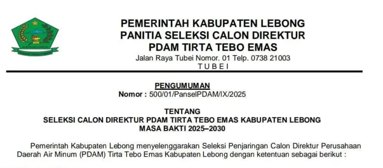 Lebong, Mediasinardunia.com - Direktur Perusahaan Daerah Air Minum (PDAM) Tirta Tebo Emas (TTE) Kabupaten Lebong kini terbuka lebar! Pemerintah Kabupaten Lebong secara resmi mengumumkan pembukaan seleksi calon Direktur PDAM TTE untuk masa bakti 2025-2030. Kesempatan ini ditujukan bagi para profesional berintegritas dan visioner untuk berkontribusi langsung pada peningkatan pelayanan air bersih bagi masyarakat Lebong.
