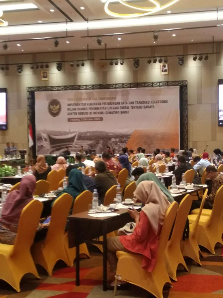 Sumatera Barat, Mediasinardunia.com - Rapat koordinasi dan sinkronisasi implementasi kebijakan perlindungan data transaksi elektronik di Provinsi Sumatra Barat telah dilaksanakan di Gedung Serbaguna Hotel Grand Zuri pada Kamis, 2 Oktober 2025. Acara ini bertujuan untuk meningkatkan literasi digital dan melindungi data nasabah dari maraknya konten negatif serta indikasi penipuan online yang saat ini banyak terjadi di Sumatra Barat.