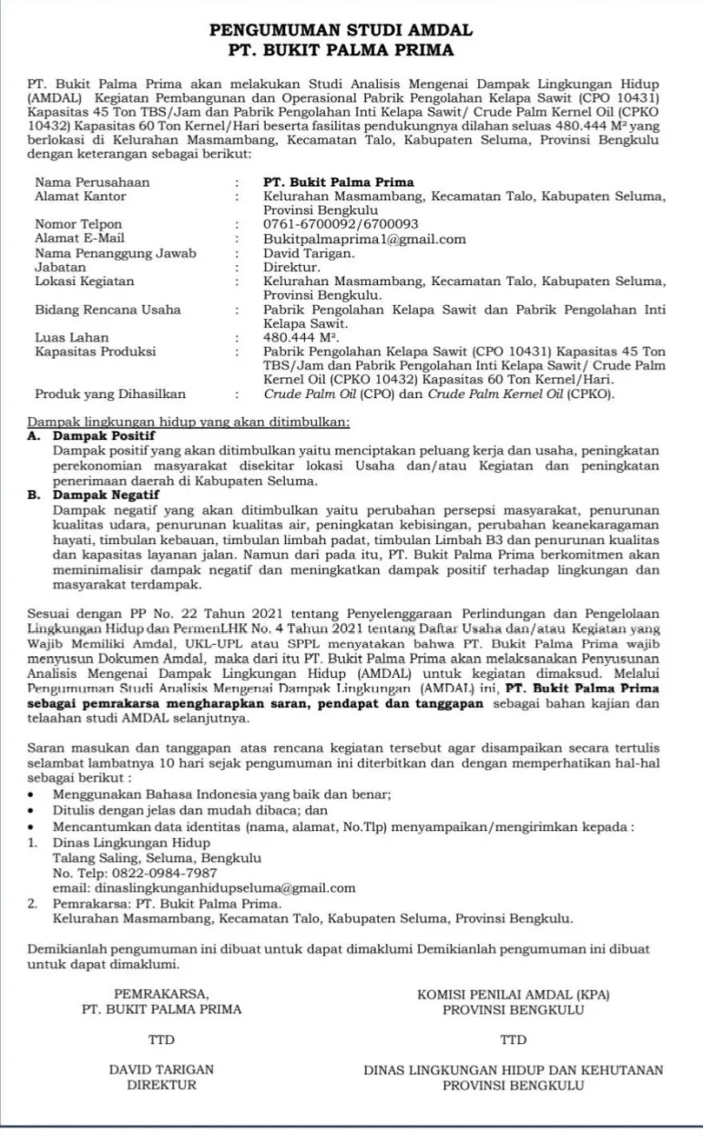 PT Bukit Palma Prima Umumkan Studi AMDAL Pembangunan Pabrik Pengolahan Sawit di Seluma