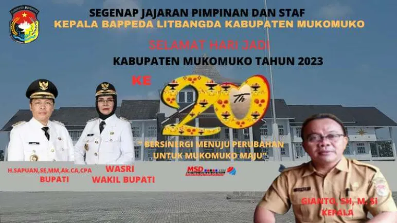 Mukomuko Segenap Jajaran Pimpinan dan Staf Kepala Bappeda Litbangda , Mengucapkan Selamat Hari Jadi Kabupaten Mukomuko Ke- 20 23 Feb 2023 04:27 Submitted by webadmin on 23 February 2023 Mukomuko Berita Terkait Apr 18, 2026 Tolak PHK Sepihak, Bupati Mukomuko Minta Perselisihan Antara Perusahaan dan Pekerja Diselesaikan dengan Musyawarah Apr 17, 2026 Pemerintah Desa Tanjung Mulya kecamatan XIV Koto Salurkan BLT DD Tahap 1 Tahun 2026 Apr 15, 2026 Gelar Innovation Award 2026, Pemkab Mukomuko Dorong OPD Kreatif dan Inovatif Apr 14, 2026 Dipimpin Camat, Seluruh Perangkat Desa di XIV Koto Ajukan Pencairan APBDes Tahap II Serentak Apr 11, 2026 Pemkab Mukomuko Luncurkan Inisiatif Pengembangan Lanskap Berkelanjutan, Gabungkan Ekologi dan Ekonomi Apr 06, 2026 Lewat Musda V, Choirul Huda Kembali Pimpin Golkar Mukomuko Secara Aklamasi