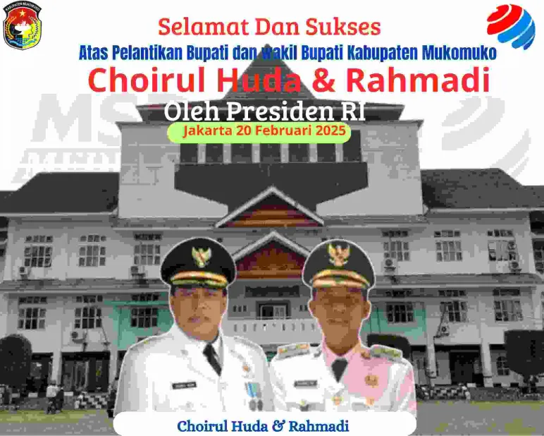 Banner Selamat Dan Sukses Atas Dilantiknya Bupati Dan wakil Bupati Kabupaten Mukomuko, Choirul Huda Dan Rahmadi. Oleh Presiden RI jakarta 20 February 2025. 20 Feb 2025 09:23 Submitted by webadmin on 20 February 2025 Mukomuko Banner ucapan selamat pelantikan Berita Terkait Apr 20, 2026 Segenap Tenaga Medis dan Staf RSUD Kabupaten Mukomuko Mengucapkan Selamat Hari Kartini Feb 26, 2026 Kepala Dinas PUPR Mukomuko Mengucapkan Selamat Hari Jadi Kabupaten Mukomuko yang ke-23 Feb 25, 2026 Dinas pertanian kabupaten Mukomuko mengucapkan selamat hari jadi kabupaten Mukomuko ke - 23 Tahun 2026 Feb 24, 2026 Dinas pendidikan dan kebudayaan sekolah SD negeri 04 air Manjuto Kabupaten Mukomuko Mengucapkan Dirgahayu Kabupaten Mukomuko Ke - 23 Feb 18, 2026 Sekda Kabupaten Mukomuko Mengucapkan Selamat Hari Jadi Kabupaten Mukomuko yang Ke-23 Feb 17, 2026 Dinas Pendidikan dan Kebudayaan SDN 14 Penarik Kabupaten Mukomuko Mengucapkan Dirgahayu Kabupaten Mukomuko yang Ke-23