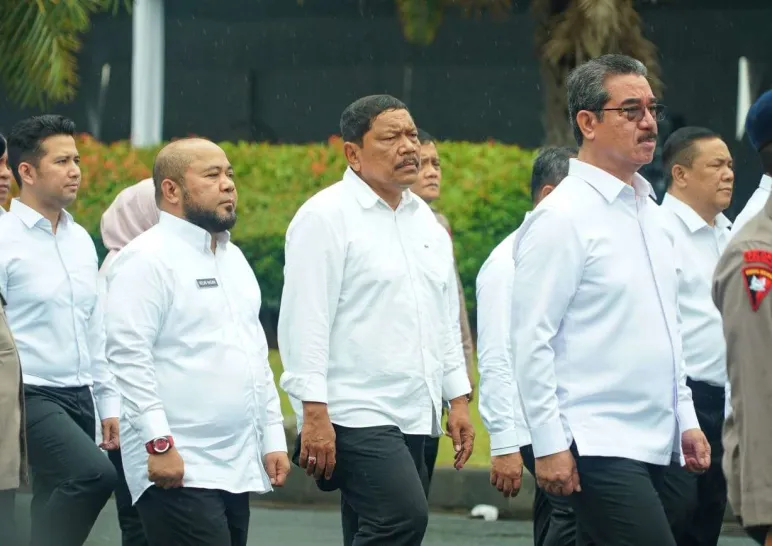 Meski gerimis menyelimuti ibu kota, prosesi tetap berjalan dengan khidmat. Para kepala daerah terpilih mengikuti rangkaian acara dengan penuh keseriusan, di mana barisan gubernur dan wakil gubernur berada di posisi terdepan, diikuti oleh rombongan wali kota dan bupati terpilih.