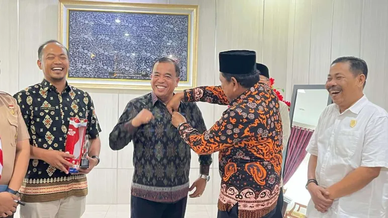 Bengkulu, Mediasinardunia.com - Wakil Gubernur Bengkulu, Mian, menyematkan Pin Merah Putih kepada Bupati Karo, Provinsi Sumatera Utara, Antonius Ginting, saat kunjungan silaturahmi di ruang kerja Wakil Gubernur Bengkulu, Jumat (14/10).