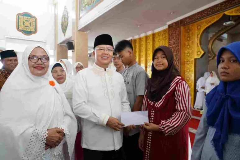 Bengkulu, Mediasinardunia.com - Gubernur Rohidin Mersyah dan Ketua TP PKK Provinsi Bengkulu Derta Rohidin hadir dalam acara Bundo Kanduang Provinsi Bengkulu Peduli. Keduanya turut menyerahkan 85 paket bantuan santunan pendidikan untuk siswa/i SMP/MTS dan SMA/MAN kota Bengkulu di Masjid Raya Baitul Izzah Bengkulu, Sabtu (7/8).