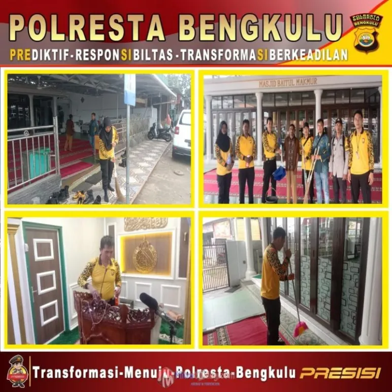 Bengkulu - Mediasinardunia.com - Dalam rangka memperingati Hut Bhayangkara ke-77, Polsek Kampung Melayu Polresta Bengkulu Polda Bengkulu melaksanakan kegiatan bhakti sosial membersihkan rumah ibadah (Masjid), Jumat (16/06/2023).