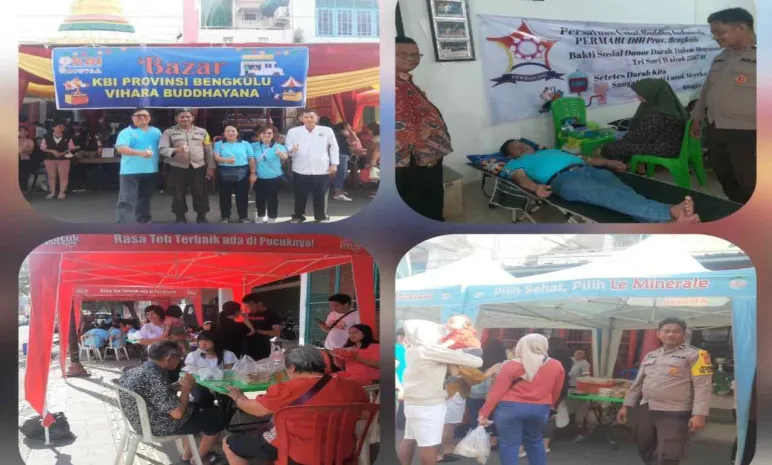 Mediasinardunia.com - Bhabinkamtibmas Personel Polsek Teluk Segara Polresta Bengkulu Polda Bengkulu Aipda Safrudin, melaksanakan kegiatan monitoring dan pengamanan Bazar, Tri Suci Waisak dan Donor Darah di Vihara Budhayana, Jalan DI Panjaitan Kelurahan Malabro Kecamatan Teluk Segara Kota Bengkulu, Minggu (21/5/2023).