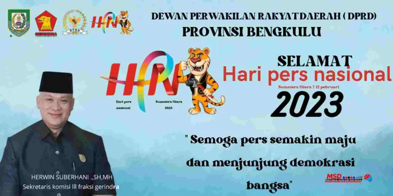 DPRD DPRD Provinsi Bengkulu HERWIN SUBERHANI, SH.MH Sekretaris Komisi III Fraksi Gerindra Mengucapkan Selamat Hari pers nasional (HPN) yang di Selenggarakan 7-12 Februari 2023 di Medan Sumatra Utara. 4 Feb 2023 06:48 Submitted by webadmin on 4 February 2023 Provinsi Bengkulu Berita Terkait Apr 21, 2026 Ketua DPRD Bengkulu Selatan Ikuti Kursus Pemantapan Pimpinan Daerah di Magelang Apr 15, 2026 DPRD Bengkulu Utara Serahkan Rekomendasi LKPJ 2025 kepada Bupati Apr 13, 2026 DPRD Bengkulu Kritik Layanan Penerbangan, Garuda Indonesia Tak Lagi Beroperasi Apr 13, 2026 Reses DPRD Lebong, Masyarakat Minta Perbaikan Infrastruktur Rusak Akibat Banjir Mar 18, 2026 DPD Partai NasDem Kota Bengkulu Serahkan SK DPRT dan Bingkisan Lebaran Mar 14, 2026 DPRD Mukomuko Dorong Pemulihan Ekonomi, Fokus Pemberdayaan UMKM