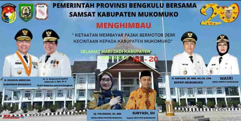 Mukomuko Gubernur Bengkulu Dan Samsat UPTD PPD Mukomuko, Menghimbau Kepada Masyarakat Untuk Membayar Pajak Kendaraan bermotor Demi Terujudnya Kecintaan Kabupaten Mukomuko, Juga Mengucapkan Selamat Hari Jadi Kabupaten Mukomuko Ke-20 23 Feb 2023 05:05 Submitted by webadmin on 23 February 2023 Mukomuko Berita Terkait Apr 22, 2026 Winarno Sebut Bupati Instruksikan Pengisian Jabatan, 137 Pejabat Bakal Dilantik Akhir Bulan Ini Apr 18, 2026 Tolak PHK Sepihak, Bupati Mukomuko Minta Perselisihan Antara Perusahaan dan Pekerja Diselesaikan dengan Musyawarah Apr 17, 2026 Pemerintah Desa Tanjung Mulya kecamatan XIV Koto Salurkan BLT DD Tahap 1 Tahun 2026 Apr 15, 2026 Gelar Innovation Award 2026, Pemkab Mukomuko Dorong OPD Kreatif dan Inovatif Apr 14, 2026 Dipimpin Camat, Seluruh Perangkat Desa di XIV Koto Ajukan Pencairan APBDes Tahap II Serentak Apr 11, 2026 Pemkab Mukomuko Luncurkan Inisiatif Pengembangan Lanskap Berkelanjutan, Gabungkan Ekologi dan Ekonomi
