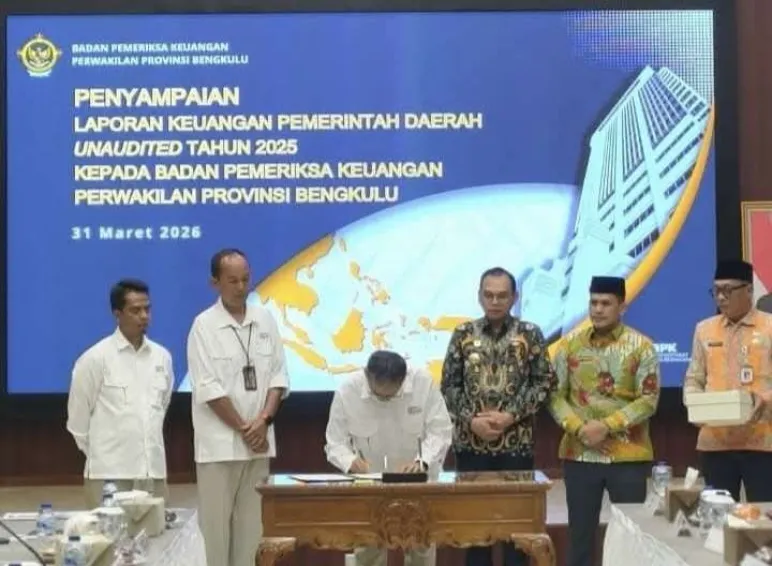 Penyerahan laporan dilakukan di Gedung BPK Bengkulu sebagai bagian dari kewajiban pemerintah daerah dalam menyampaikan laporan keuangan untuk pemeriksaan oleh BPK sebelum memperoleh opini resmi.