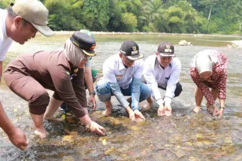 Bengkulu Selatan, Mediasinardunia.com - Setelah diresmikan oleh Bupati Bengkulu Selatan Gusnan Mulyadi, SE., MM di Lubuk Larangan, Desa Sebilo dan Kelurahan Masat, Kecamatan Pino, Kabupaten Bengkulu Selatan, dilakukan pelepasan ratusan ekor bibit ikan emas di Sungai Air Manna.