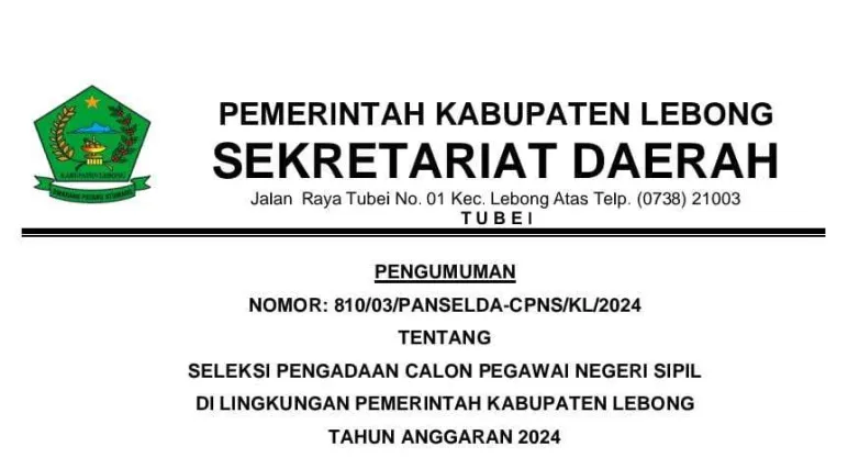 Lebong, Mediasinardunia.com - Pemerintah Kabupaten (Pemkab) Lebong secara resmi mengumumkan seleksi Calon Pegawai Negeri Sipil (CPNS) Tahun Anggaran (TA) 2024. Seleksi CPNS TA 2024 ini dibuka untuk 600 formasi yang seluruhnya merupakan tenaga teknis.