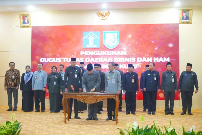 Gugus Tugas Daerah Bisnis dan Hak Asasi Manusia dikukuhkan langsung oleh Gubernur Bengkulu Rohidin Mersyah yang disaksikan Kepala Kantor Wilayah Kemenkumham Provinsi Bengkulu, di Balai Raya Semarak Bengkulu, Selasa (23/04).