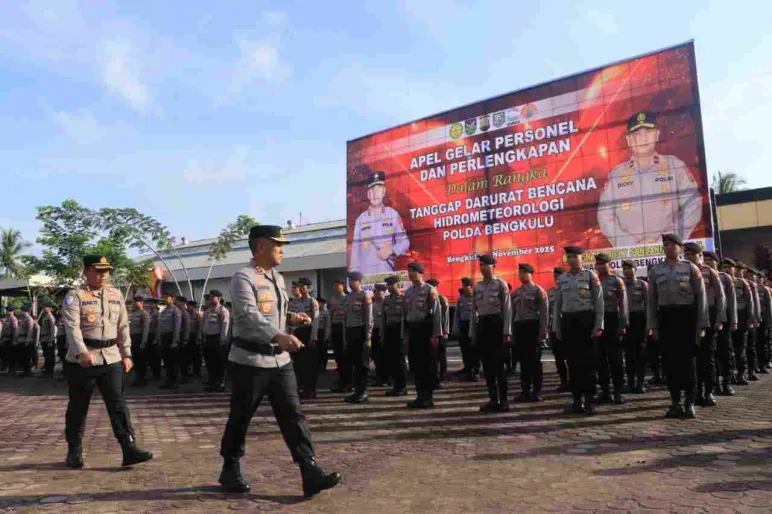 Bengkulu, Mediasinardunia.com – Dalam rangka mengantisipasi potensi bencana hidrometeorologi di wilayah Provinsi Bengkulu, Polda Bengkulu menggelar Apel Personel dan Perlengkapan Tanggap Darurat Bencana di Lapangan Anton Soejarwo, Rabu (5/11/2025). Apel yang dimulai pukul 07.00 WIB ini dipimpin langsung oleh Kapolda Bengkulu Irjen Pol. Mardiyono, S.I.K., M.Si., dan dihadiri oleh Wakapolda Bengkulu Brigjen Pol. Dicky Sondani, S.I.K., M.H., Ketua DPRD Provinsi Bengkulu, Sekda Provinsi Bengkulu, serta perwakilan Forkopimda dan stakeholder terkait.