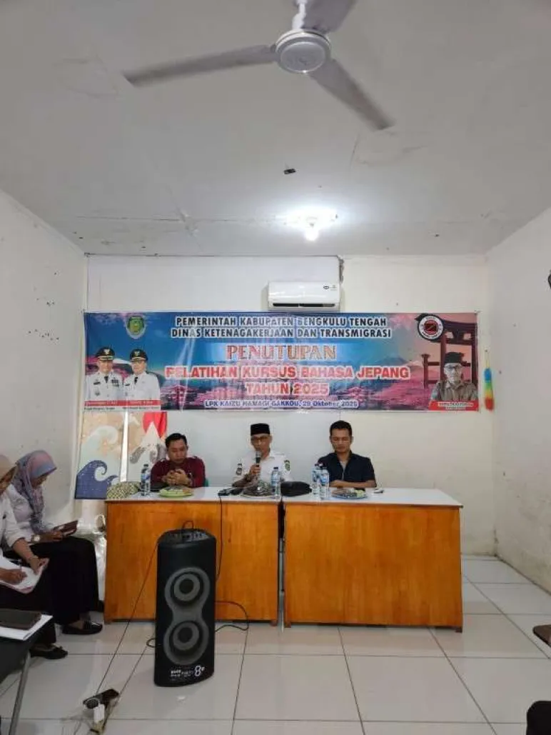 Bengkulu Tengah, Mediasinardunia.com - Pemerintah Kabupaten Bengkulu Tengah melalui Dinas Tenaga Kerja dan Transmigrasi (Disnakertrans) bekerja sama dengan Lembaga Pelatihan Kerja (LPK) Kaizu Hamagi Gakkou resmi menutup kegiatan Pelatihan Kursus Bahasa Jepang Tahun 2025 yang telah dibuka pada 1 Agustus 2025 lalu, Kamis (30/10/2025).