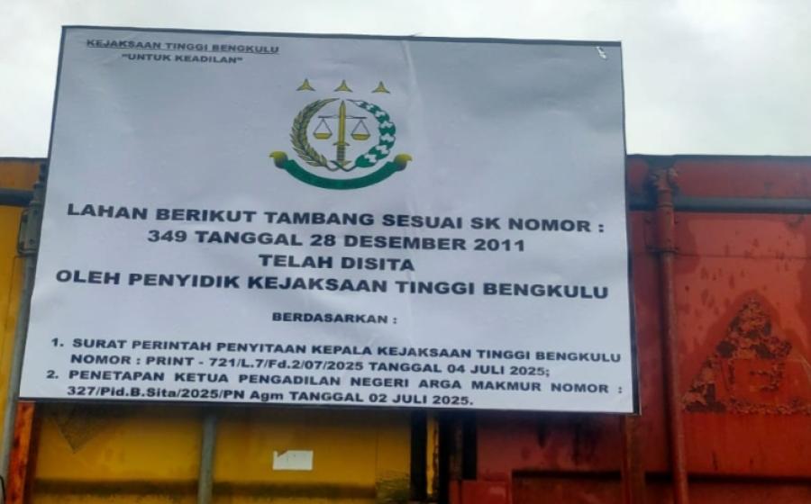 Bengkulu, Mediasinardunia.com – Penyidik Kejaksaan Tinggi (Kejati) Bengkulu menyita perusahaan pertambanga