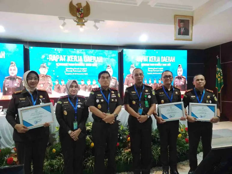 Bengkulu, mediasinardunia.com - Kepala Kejaksaan Negeri Bengkulu Yunitha Arifin, S.H., M.H. didampingi para Kasi dan Kasubag dalam rangka penutupan Rapat Kerja Daerah Kejaksaan Tinggi 2023 menerima penghargaan dari Kepala Kejaksaan Tinggi Bengkulu Dr. Heri Jerman, S.H., M.H. sebagai Juara Umum Pertama Satuan Kerja dengan kinerja terbaik se-wilayah hukum Kejaksaan Tinggi Bengkulu, Kamis 29 Desember 2022.