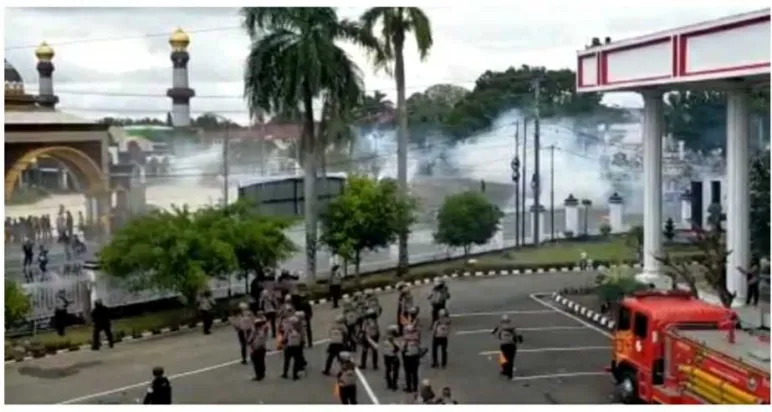 Para pengunjuk rasa berhamburan menyelamatkan diri hingga masuk ke di halaman masjid Masjid Raya Baitul Izzah, dan halaman Gedung Juang.