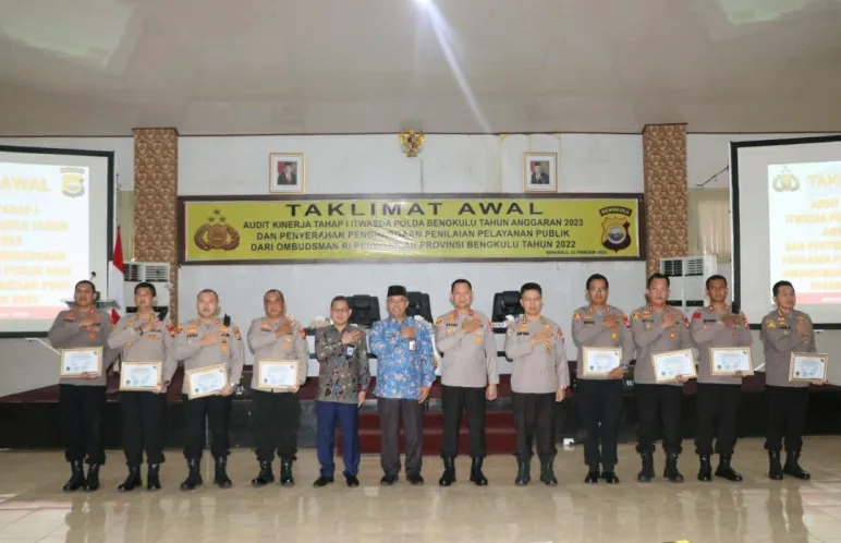 Mukomuko - mediasinardunia.com - Kapolres Mukomuko menghadiri taklimat awal Audit Kinerja Itwasda Polda Bengkulu Tahap I T.A 2023 dan penyerahan penghargaan dari Ombudsman RI perwakilan Provinsi Bengkulu. Rabu (22/2/2023).