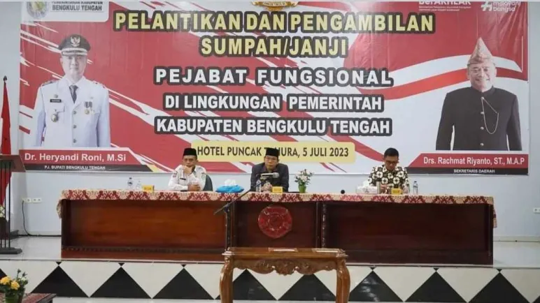 Bengkulu Tengah, Mediasinardunia.com - Asisten Bidang Adminitrasi Umum H. Elyandes Kori, S.E., M. Si Mengambil sumpah/janji 140 orang Pejabat Fungsional di ruang lingkup pemerintah Kabupaten Bengkul Tengah bertempat di aula Hotel Puncak Taura Kecamatan Pondok Kubang. Rabu (05/07/2023)