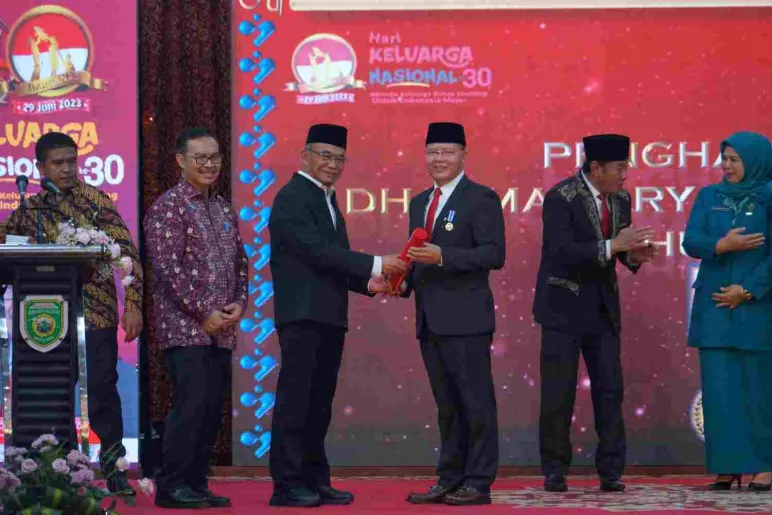 Penghargaan diserahkan langsung Menko PMK Muhadjir Effendy didampingi Kepala BKKBN RI Hasto Wardoyo di Griya Agung di Rumah Dinas Gubernur Sumatera Selatan, Selasa Malam (4/7/2023)