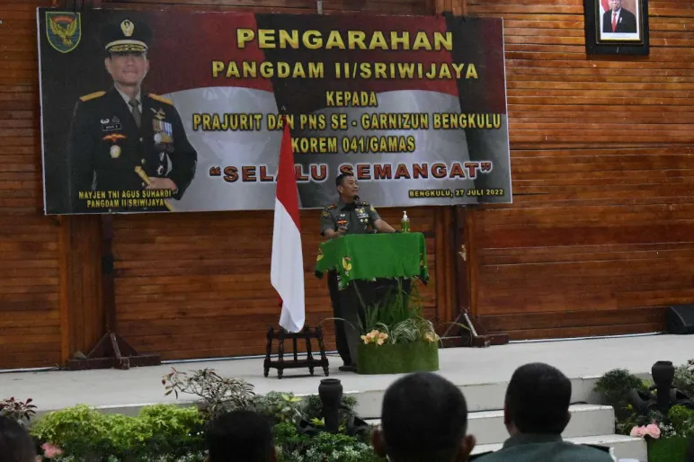 Bengkulu - Mediasinardunia.com - Pangdam II/Sriwijaya Mayjen TNI Agus Suhardi memberikan pengarahan kepada Prajurit dan PNS Korem 041/Gamas segarnizun Bengkulu bertempat di Balai Prajurit Korem 041/Gamas, Bengkulu(27/7/22)