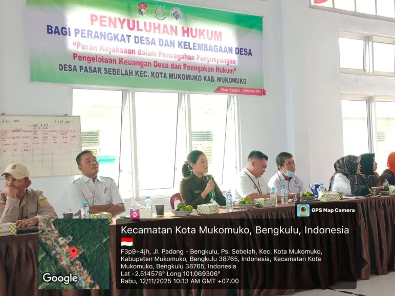 Mukomuko, Mediasinardunia.com - Desa Pasar Sebelah, Kecamatan Kota Mukomuko, Kabupaten Mukomuko, melaksanakan penyuluhan hukum bagi aparatur desa pada 19 November 2025. Kegiatan ini difokuskan pada pengelolaan keuangan desa dan pelaksanaan pembangunan, serta menyampaikan informasi hukum kepada perangkat desa, tokoh masyarakat, dan lembaga desa lainnya. Tujuannya adalah meningkatkan kesadaran hukum, kepatuhan terhadap aturan, dan kemampuan menyelesaikan masalah hukum di tingkat desa.